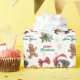 The repeated pattern on this Christmas wrapping paper includes an image of a Bernese Mountain Dog wearing a red and white Santa Claus hat. Also included in the pattern is a gingerbread man, a red bow, a holly sprig with red berries, and varied sizes of ornate gold snowflakes. Stylized red and green text says MERRY CHRISTMAS" and "HAPPY NEW YEAR". Be sure to see the many other products with dog images (and cats, too!) at Dog Village.
