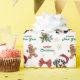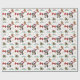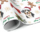 The repeated pattern on this Christmas wrapping paper includes an image of a Greater Swiss Mountain Dog wearing a red and white Santa Claus hat. Also included in the pattern is a gingerbread man, a red bow, a holly sprig with red berries, and varied sizes of ornate gold snowflakes. Stylized red and green text says MERRY CHRISTMAS" and "HAPPY NEW YEAR". Be sure to see the matching gift tags in our store.