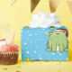 Sapo de Natal verde e bonito vestindo um chapéu de Papai Noel vermelho e branco sobre um fundo azul com muitos flocos de neve brancos.
