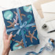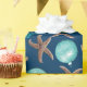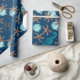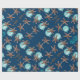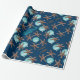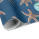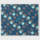 Papel de embrulho de presente de Natal tropical com estrelas-do-mar, cavalos-do-mar e ornamentos de bola azul-aqua impressos sobre cor azul-marinho escura.
