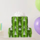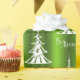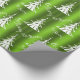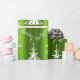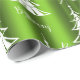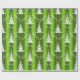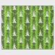 Este documento de embalagem de Natal, festivo, verde e branco, apresenta um padrão moderno de árvores de Natal brancas, com as palavras "Seja Feliz" espalhadas sobre um fundo verde brilhante e colorido.