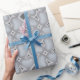 Este papel de embrulho apresenta um padrão repetitivo de azulejo de corações perdidos prateados em torno de um diamante central. Papel de embrulho de excelente para casamentos e presentes de aniversário de prata.