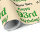 Este design de papel básico e personalizável de empacotamento de aniversário apresenta uma mensagem como "A-Name-Here, Happy 93rd aniversário!", onde o nome e o número de aniversário podem ser personalizados. O fundo é cor de bronzeado. Um papel de enrolar como este pode ser usado ao embrulhar presentes que estão sendo dados a alguém em comemoração de seu aniversário. [~Z0000243]