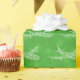 Lots of beautiful snowflakes cluster together to from an airliner on green with more green snowflakes.
