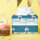 Um bonitinho bonitinho em flocos de neve segurando um cartaz branco com o texto Feliz de Natal.