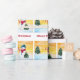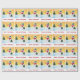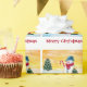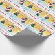 Bonito bonitão de Natal, papel de embrulho para crianças com desejo de Feliz Natal. O design apresenta bonitinho bonitinho de neve com chapéu azul e cachecol vermelho, com cana doce em sua mão. As árvores de Natal têm estrelas amarelas.