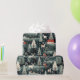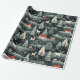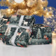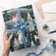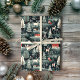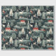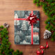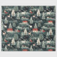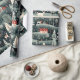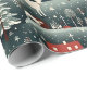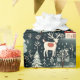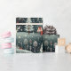 Uma cena de inverno exuberante e neve com cervos brancos viajando em campos cobertos de neve pintados com fazendas vermelhas e brancas e cercados por corações de pinheiros de inverno.