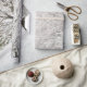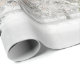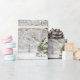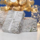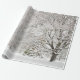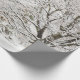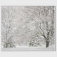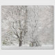 A design apresenta uma fotografia de árvores cobertas de neve na floresta.