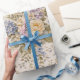 A light and airy floral pattern featuring creamy ivory roses paired with delicate clusters of pale blue and buttery yellow blossoms. Gentle sage-green foliage and fine botanical details are set against a warm, softly textured background, creating a serene and timeless look. The overall effect is elegant, romantic, and understated.