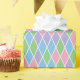 This fun geometric pattern, a traditional harlequin arrangement of diamond shapes, is colored in a soft pastel theme with pink, blue, green, and purple. The pale color scheme works well for birthdays, baby showers, or everyday gifts.