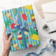 Papel-tipo para invólucro de Verão, com padrão de sorvetes, palitos, picolés e frutas sobre folhas e tiras de palma tropicais