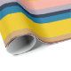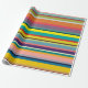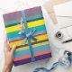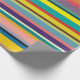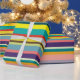 Este papel de embrulho tem um design de faixas horizontais em tons de azul, verde, marrom, roxo, vermelho, amarelo, laranja e rosa.