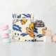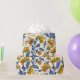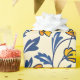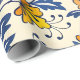 Seamless pattern of orange and yellow flowers with blue leaves on a beige background. The floral motif creates a lively, cheerful tone.