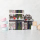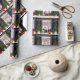 Papel de embalagem personalizado para o Natal. Use a modelo para carregar sua própria foto. Cena de inverno com uma árvore verde, boneco de neve, rena e trenó. Feliz Natal na fonte do script da cinza de prata.