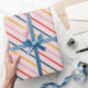 The paper features a large-scale, mid-century modern geometric pattern consisting of diagonal stripes. The design uses a coordinated mix of muted coral, sunny mustard yellow, and sage green set against a soft lavender or pale pink background. Perfect for birthdays, holidays, or everyday gifting, this design adds a joyful pop of color to any present—no extra embellishments needed.