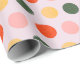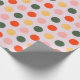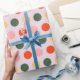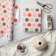 The paper features a mid century modern polka dots pattern. The design uses a coordinated mix of muted coral, sunny mustard yellow, and sage green set against a soft lavender or pale pink background. Perfect for birthdays, holidays, or everyday gifting, this design adds a joyful pop of color to any present—no extra embellishments needed.