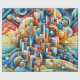 A textured artwork of an abstract colorful city with the sun rising