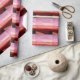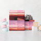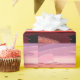 Um design de arte abstrato do pôr do sol em cores rosa, lilás, preta, vermelha e pêssego.