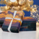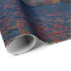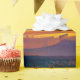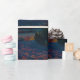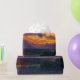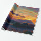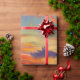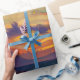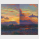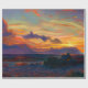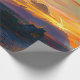 Um design de arte de um belo pôr do sol também mostrando rochas, praia e um homem pescando.
