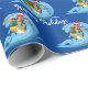 Feliz surfista de Férias vestindo um boné de Papai Noel e surfando em uma onda azul com água salgada. A cor de fundo pode ser alterada.