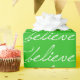 Papel de embrulho de férias com texto branco marcado que diz "Eu acredito!" Você pode personalizar o plano de fundo verde para ser qualquer cor que quiser.