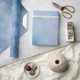 Este belo papel de embrulho apresenta uma imagem de uma aquarela (ou, em inglês, aquarela). Há uma simples lavagem azul através da canvas que lhe dá um efeito elegante, artístico e relaxante. Talvez seja evocativo de um belo céu repleto de nuvens brancas.
