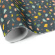 Mergulhe no antigo fascínio desse padrão terrazzo. Uma mistura harmoniosa de sofisticação e beleza orgânica. Inspirado pelo antigo artesanato veneziano, esse padrão apresenta uma rica tapeçaria de cores mutadas, simulação de mármore falso, quartzo e fragmentos granitos. Papel de embrulho perfeito que sofisticado amigo ou designer de interiores que ama texturas e materiais naturais orgânicos. Seu pacote parecerá tão luxuoso do lado de fora como o dentro de presente. Design de padrão: padrão terrazzo multicolorido composto por formas de seixo orgânico abstrato em cores de verde, coral, amarelo, marrom e aqua sobre fundo azul marinho