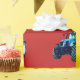 Tratores azuis em vermelho fazem um design de feriado alegre. Personalize o texto ou deixe de lado.