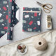 Os trenós e os flocos de neve modelados Funky do inverno caem através de um fundo dos azuis marinhos. Um esquema de cores moderno do vermelho, do marinho, do aqua e do branco faz uma indicação corajosa. Tag e fita de coordenação do presente também disponíveis.