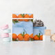 Vista aproximada de uma linha de três frutas tangerinas de citros com folhas verdes e gotas de água na pele. Fundo azul texturizado. Contraste das cores laranja, verde e azul.
