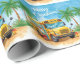 A fun and refreshing tropical twist on Christmas! This bright watercolor illustration features Santa in a Hawaiian shirt standing beside a cheerful school bus decorated with palm leaf wreaths and holiday lights. Perfect for school bus drivers in warm states like Florida, Hawaii, California, and Texas — or anyone who loves a sunny Christmas vibe.