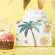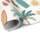 Bright tropical pattern wrapping paper featuring palm trees, surfboards, citrus slices, flip flops, and fruity drinks in a fun summer-inspired style. Ideal for beach lovers, surfers, vacation fans, and anyone who loves colorful tropical aesthetics.
