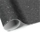 um rolo de papel de contacto de granito preto com uma textura salpicada, enrolado numa extremidade para revelar uma parte inferior prateada, sobre um fundo branco