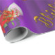 Um papel muito colorido de embrulho de natal de unicórnio roxo, com um padrão de faces festivas de unicórnio em vermelho e branco, com poinsettia nas suas cabeças, chifres listrados vermelhos e brancos e pestanas grandes e largas e vermelhas, todas num fundo roxo metálico. A mensagem de Natal em ouro diz "Acredite". Um plástico de Natal excelente para amantes de unicórnio, ou projetos de artesanato de Natal.