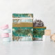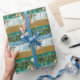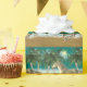 Unicórnio branco doce que galopa através de uma praia tropical.