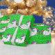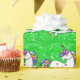 Um papel de embrulho de unicórnio colorido, esparso e esbranquiçado, com um padrão de pequenos unicórnios gordinhos, com cabelo cor arco-íris, homem e cauda, estrelas douradas em seus corpos e cascos de ouro. Eles estão dançando sobre um fundo verde brilhante de brilho brilhante. Este invólucro verde de unicórnio seria ideal para um presente de festa de aniversário infantil, para artesanatos de unicórnio e muito mais.