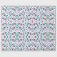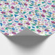 Unrolled and flat views of vibrant floral wrapping paper featuring intricate patterns with pink, blue, and yellow flowers on a white background.