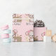 Ursinho-peludo castanho-branco com padrão de verificação branco e rosa-bebê com cesto de piquenique, coelho e pacificador. "É uma Garota!" modelo fornecido.