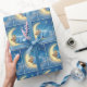Um ursinho de pelúcia fofo é acolhido confortavelmente num cobertor azul, descansando pacificamente sobre uma lua crescente brilhando em um céu noturno sonolento