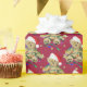 Urso de pelúcia castanho e bonito enredado em luzes de Natal sobre fundo vermelho com estrelas douradas.