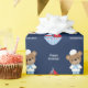 O adorável design náutico apresenta uma ilustração fofa de um macaco vestindo uma roupa de marinheiro e um veleiro azul-claro e vermelho. Personalize-o com um nome ou texto da sua escolha para um design.