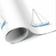 Um teste padrão de repetição de veleiros azuis do sloop com velas brancas decora este papel de envolvimento temático da navigação. Os veleiros de Sloop têm um mastro e duas velas, chamados "patíbulo" e "mainsail".