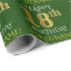 Este design de papel de embrulho apresenta uma mensagem como "FELIZ 18º ANIVERSÁRIO", com o "18º" a ter uma aparência falsa/imitação de ouro. Ele também apresenta um nome que pode ser personalizado, e um fundo de cor verde. Talvez possa ser utilizada quando se dá presentes para o décimo oitavo aniversário de alguém. [~Z0000132]
