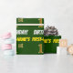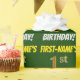 Este design de papel de embrulho apresenta uma mensagem como "primeiro aniversario DO PRIMEIRO NOME!", com a "rua" a ter uma aparência de cor falsa/imitada de ouro, e com o nome e "BIRTHDAY" numa fonte divertida e ousada. O nome pode ser personalizado e o fundo tem cor verde. Um papel de embrulho como este poderia talvez ser usado no embrulho de presentes de aniversário que são dados a alguém em comemoração do seu primeiro aniversário. [~Z0000208]