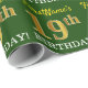 Este design de papel de embrulho apresenta uma mensagem como "FirstName's 19th BIRTHDAY!", com o "19º" a ter uma aparência de cor falsa/imitada em ouro. O nome pode ser personalizado e o fundo tem cor verde. Talvez possa ser utilizada quando se dá presentes para o décimo nono aniversário de alguém. [~Z0000179]