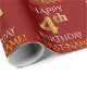 Este design de papel de embrulho apresenta uma mensagem como "FELIZ 4º ANIVERSÁRIO", com o "4º" a ter uma aparência falsa/de ouro de imitação. Também apresenta um nome personalizável e um fundo de cor vermelha. Talvez possa ser utilizado quando se trata de embrulhar presentes para o quarto aniversário de alguém. [~Z0000131]