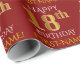 Este design de papel de embrulho apresenta uma mensagem como "FELIZ 18º ANIVERSÁRIO", com o "18º" a ter uma aparência falsa/imitação de ouro. Ele também apresenta um nome que pode ser personalizado e um fundo de cor vermelha. Talvez possa ser utilizada quando se dá presentes para o décimo oitavo aniversário de alguém. [~Z0000131]