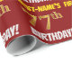 Este design de papel de embrulho apresenta uma mensagem como "PRIMEIRO NOME'S 77th BIRTHDAY!", com o "77º" a ter uma aparência de cor falsa/imitada em ouro, e com o nome e "BIRTHDAY" numa fonte divertida e ousada. O nome pode ser personalizado, e o fundo tem cor vermelha. Um papel de embrulho como este poderia talvez ser usado no embrulho de presentes de aniversário que são dados a alguém em comemoração de seus setenta e sete anos. [~Z0000204]
