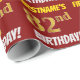 Este design de papel de embrulho apresenta uma mensagem como "82º ANIVERSÁRIO DO FIRSTNAME!", com o "82º" a ter uma aparência falsa/imitada de cor dourada, e com o nome e o "ANIVERSÁRIO" numa fonte divertida e ousada. O nome pode ser personalizado e o plano de fundo é vermelho. Um papel de embrulho como este poderia talvez ser usado no embrulho de presentes de aniversário que são dados a alguém em comemoração do seu oitenta e segundo aniversário. [~Z0000204]