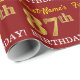 Este design de papel de embrulho apresenta uma mensagem como "First-Name’s 87th BIRTHDAY!", com o "87th" a ter uma aparência falsa/de cor dourada. O nome pode ser personalizado, e o fundo tem cor vermelha. Talvez possa ser utilizado quando se dá presentes para o oitenta e sétimo aniversário de alguém. [~Z0000178]